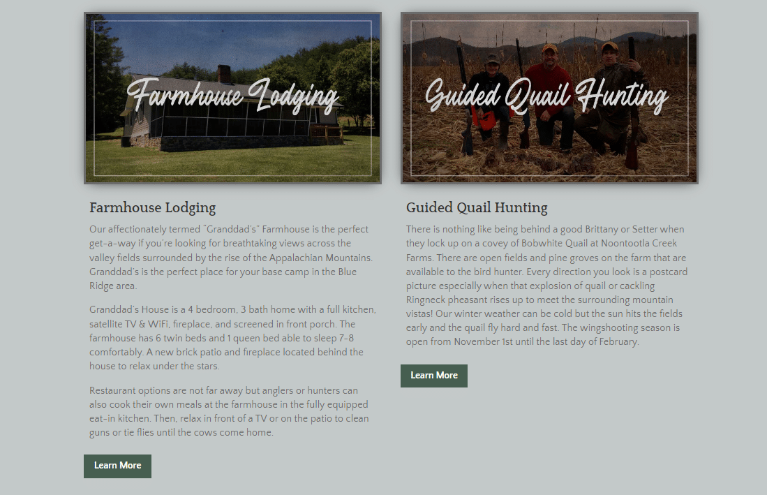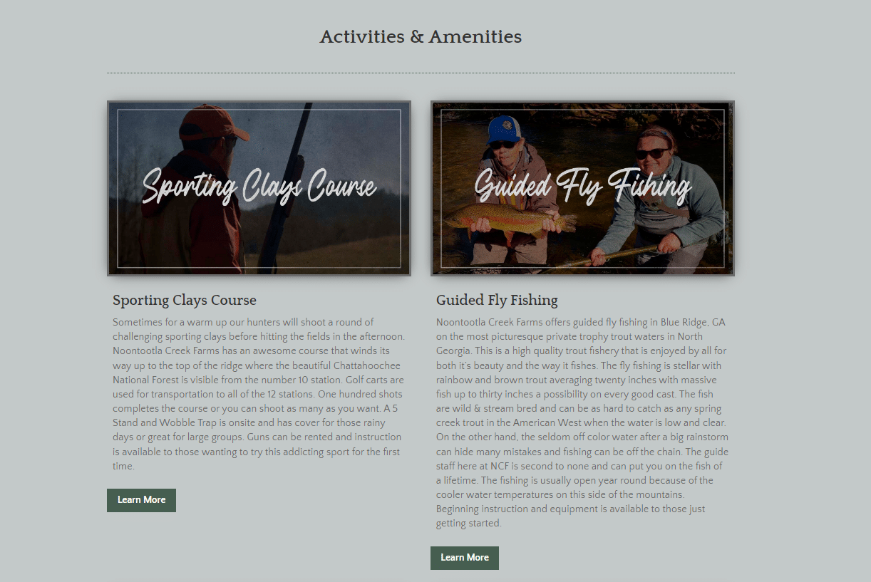 Noontootla Creek Farms (NCF) in Blue Ridge, Georgia, offers a variety of outdoor sporting activities, particularly focused on hunting and sporting clays. The farm is set on over 1,000 acres of scenic land in North Georgia and is known for its high-quality fly fishing, quail hunting, and sporting clays course.