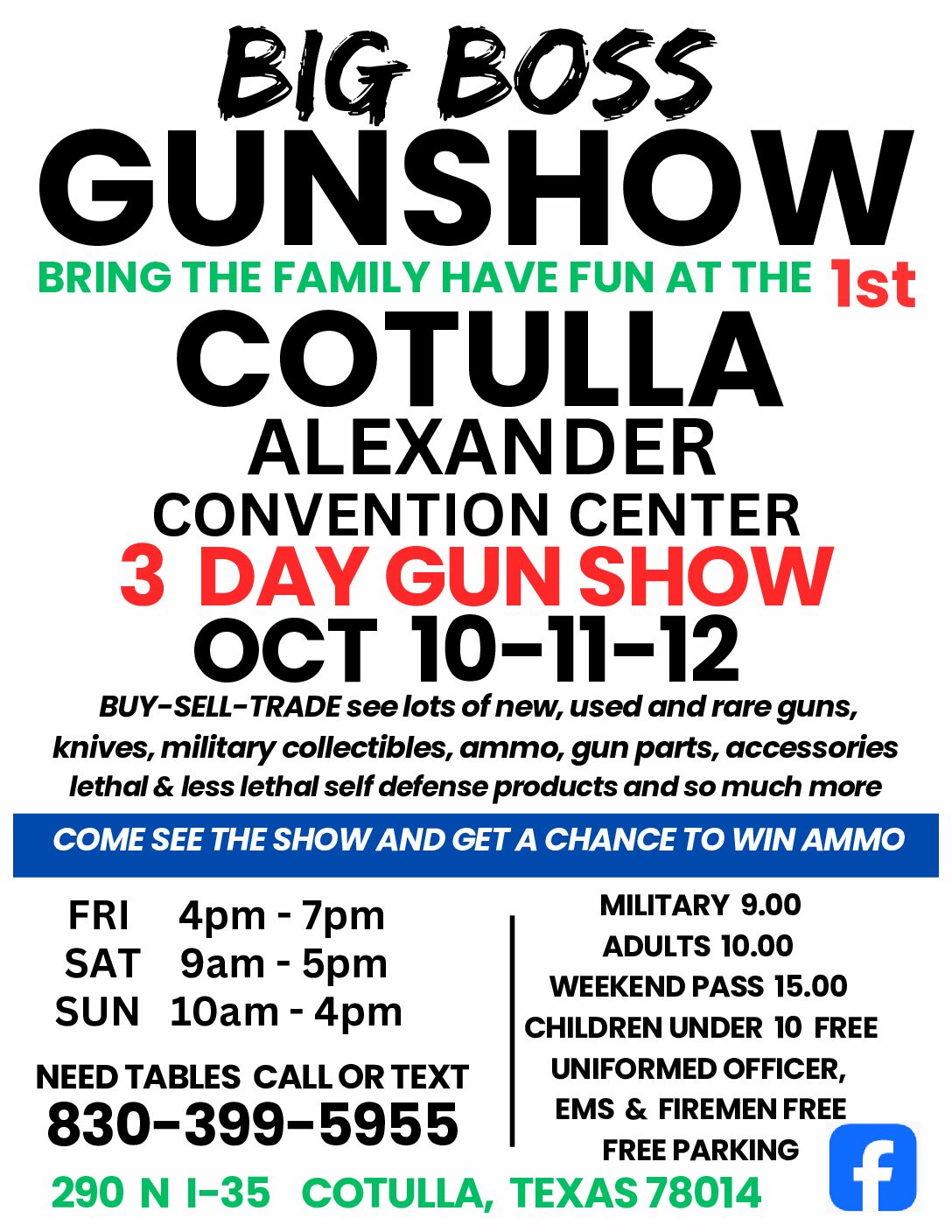 The Cotulla 3-Day Gun Show currently has no upcoming dates scheduled in Cotulla, TX. This Cotulla gun show is held at Alexander Convention Center and hosted by Big Boss Gun Shows LLC. All federal and local firearm laws and ordinances must be obeyed.