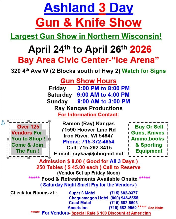 The Ashland 3 Day Gun & Knife Show will be held on Apr 24th-26th, 2026 in Ashland, WI. This Ashland gun show is held at Bay Area Civic Center- “Ice Arena” and hosted by Ray Kangas Productions. All federal and local firearm laws and ordinances must be obeyed.