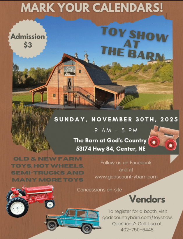 The The Barn at God’s Country Gun Show will be held on Mar 28th-30th, 2026 in Center, NE. This Center gun show is held at The Barn at God's Country and hosted by God's Country Barn. All federal and local firearm laws and ordinances must be obeyed.