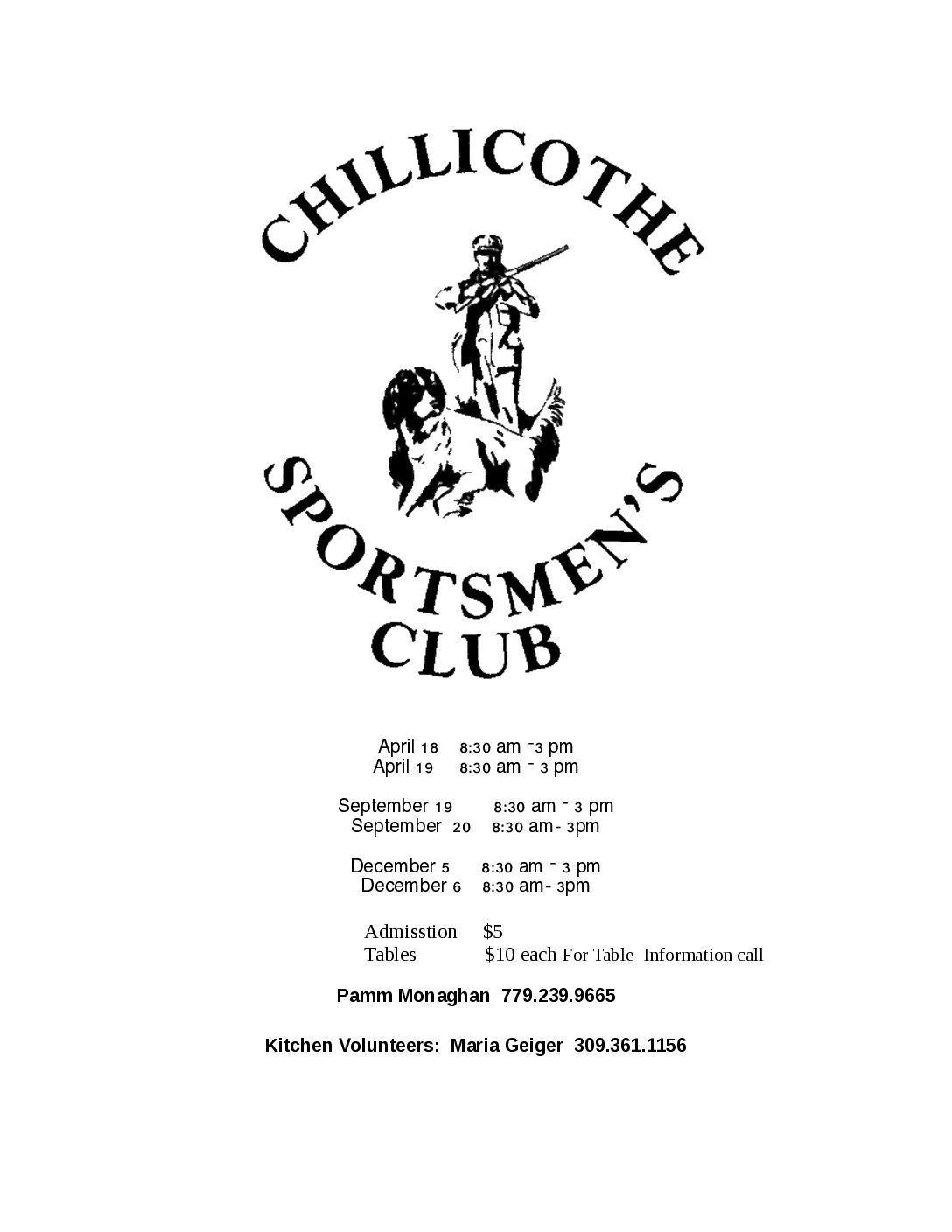 The Chillicothe Sportsmen’s Club Gun & Knife Show will be held next on Sep 19th-20th, 2026 with additional shows on Dec 5th-6th, 2026, in Chillicothe, IL. This Chillicothe gun show is held at Chillicothe Sportsmen's Club House and hosted by Chillicothe Sportsmen's Club. All federal and local firearm laws and ordinances must be obeyed.