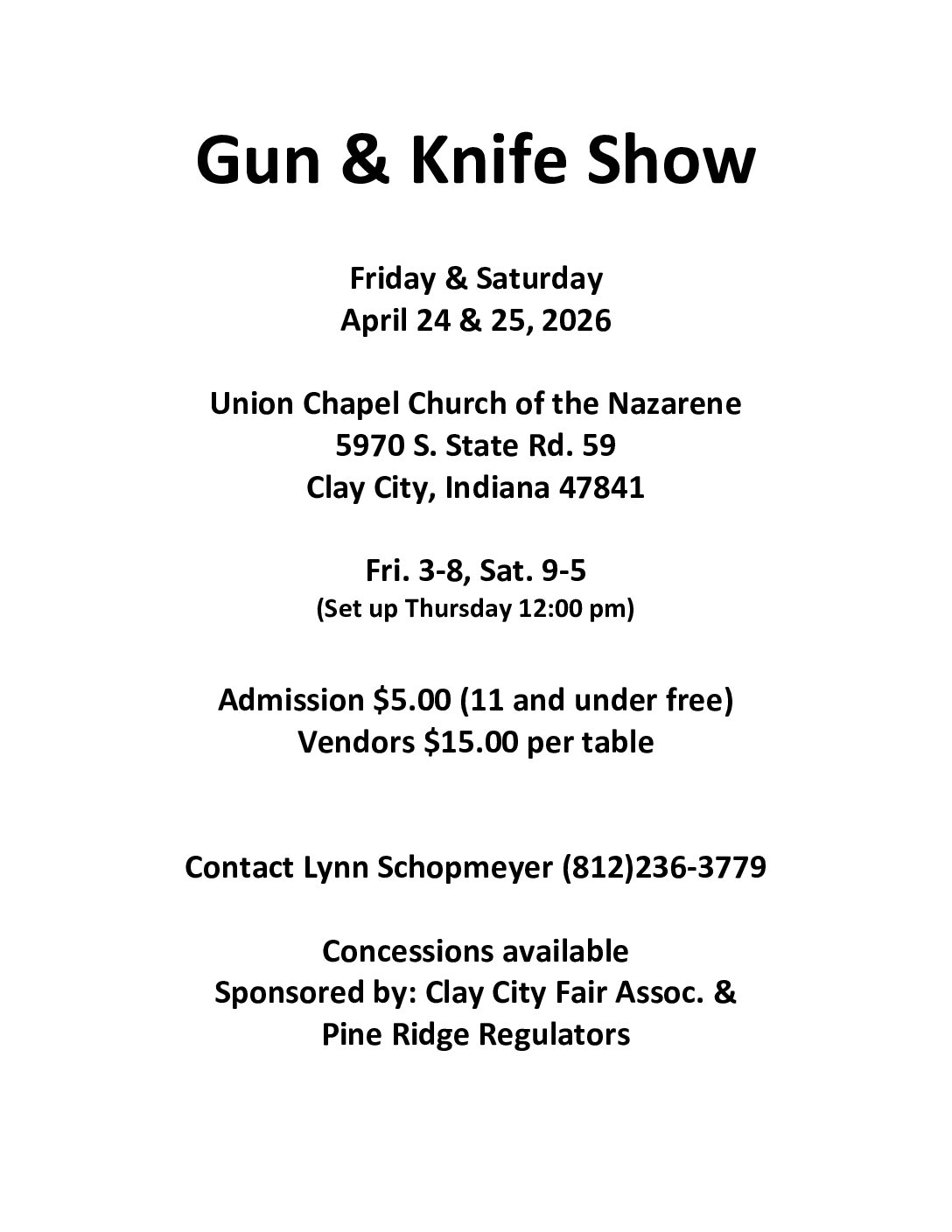 The Clay City Fair Association Gun & Knife Show will be held on Apr 24th-25th, 2026 in Clay City, IN. This Clay City gun show is held at Union Chapel Church of the Nazarene and hosted by Clay City Fair Association. All federal and local firearm laws and ordinances must be obeyed.