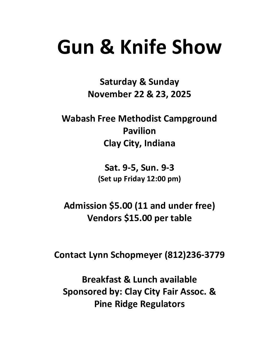 The Clay City Fair Association Gun and Knife Show currently has no upcoming dates scheduled in Clay City, IN. This Clay City gun show is held at Wabash Free Methodist Campground Pavilion and hosted by Clay City Fair Association. All federal and local firearm laws and ordinances must be obeyed.