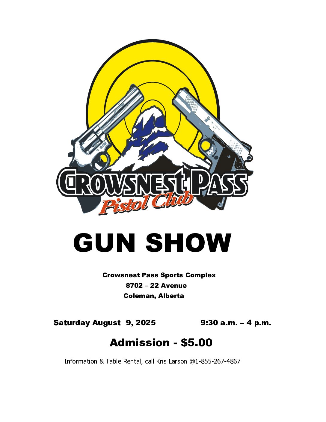 The Crowsnest Pass Pistol Club Show currently has no upcoming dates scheduled in Coleman, AB. This Coleman gun show is held at Crowsnest Pass Sports Complex and hosted by Crowsnest Pass Pistol Club. All federal and local firearm laws and ordinances must be obeyed.
