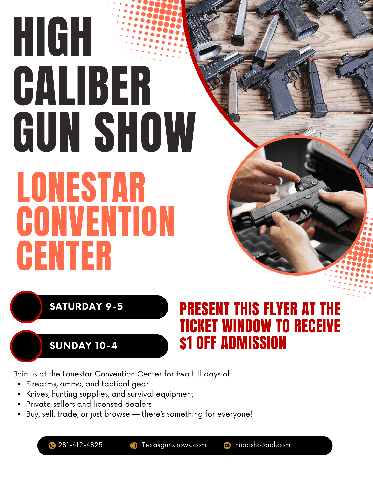 The Conroe Gun & Knife Show will be held next on May 16th-17th, 2026 with additional shows on Jun 27th-28th, 2026, Jul 25th-26th, 2026, Aug 22nd-23rd, 2026, Sep 26th-27th, 2026, Oct 24th-25th, 2026, Nov 21st-22nd, 2026, and Dec 19th-20th, 2026 in Conroe, TX. This Conroe gun show is held at Lone Star Convention Center and hosted by High Caliber Gun & Knife Show. All federal and local firearm laws and ordinances must be obeyed.