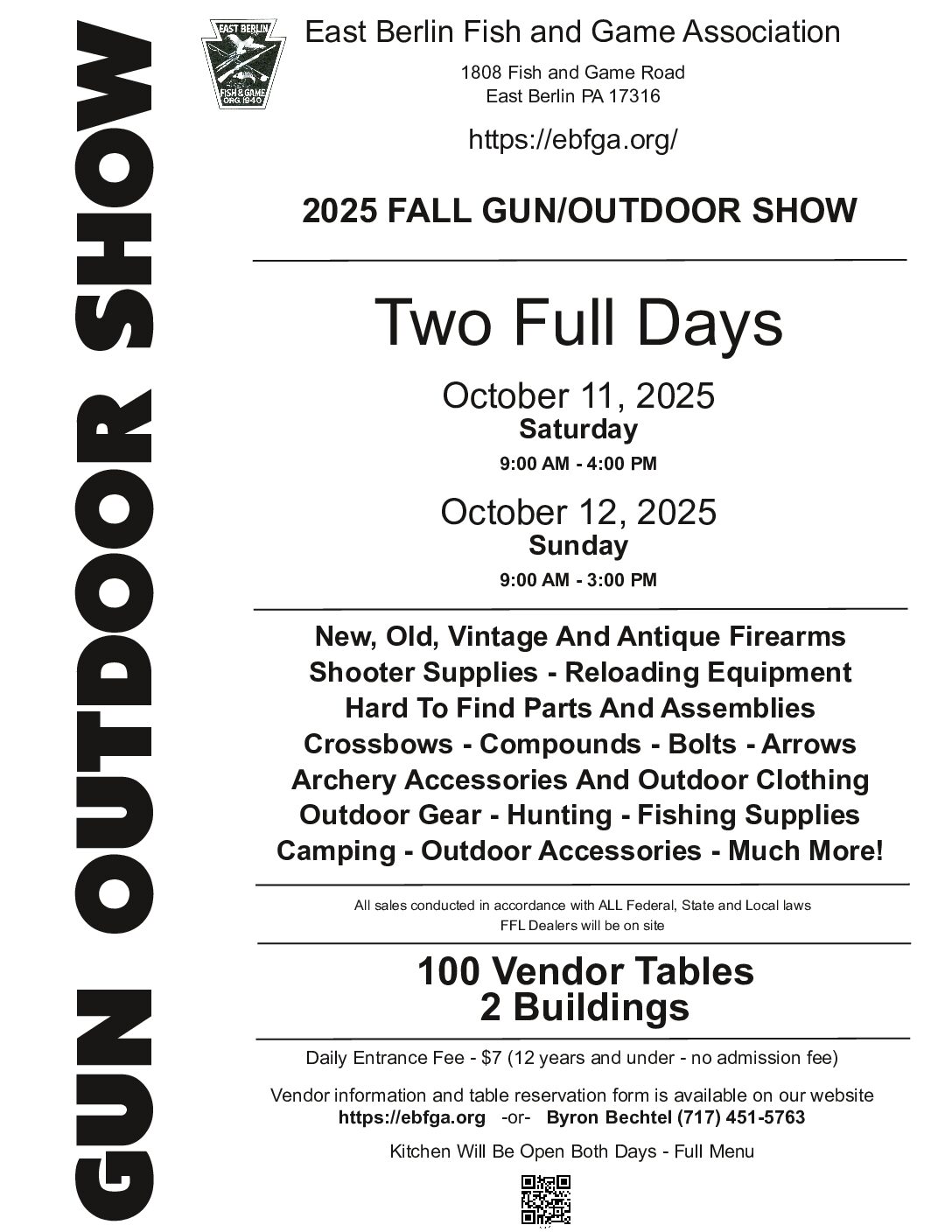 The 2025 FALL GUN/OUTDOOR SHOW currently has no upcoming dates scheduled in East Berlin, PA. This East Berlin gun show is held at East Berlin Fish & Game and hosted by East Berlin Fish & Game. All federal and local firearm laws and ordinances must be obeyed.