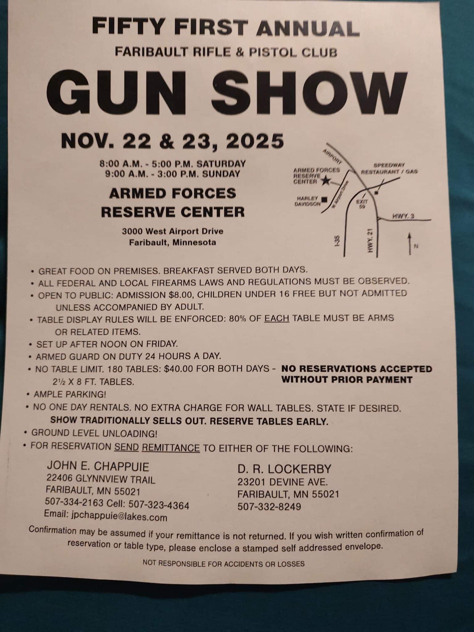 The 51st Annual Faribault Rifle & Pistol Club Gun Show currently has no upcoming dates scheduled in Faribault, MN. This Faribault gun show is held at Armed Forces Reserve Center and hosted by Faribault Rifle and Pistol Club. All federal and local firearm laws and ordinances must be obeyed.