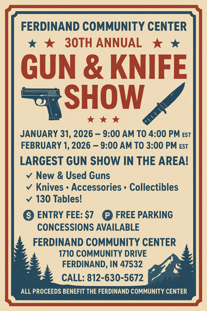 The Ferdinand Community Center Gun and Knife Show currently has no upcoming dates scheduled in Ferdinand, IN. This Ferdinand gun show is held at Ferdinand Community Center and hosted by Ferdinand Community Center. All federal and local firearm laws and ordinances must be obeyed.