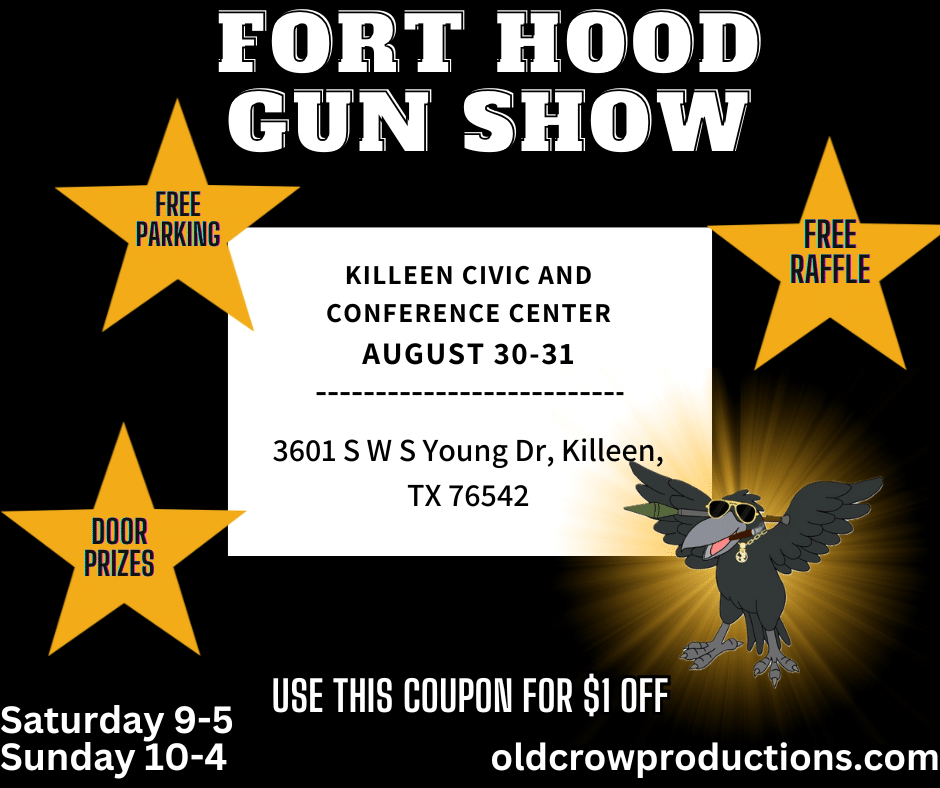 The Fort Hood Gun Show will be held on Aug 30th-31st, 2025 in Killeen, TX. This Fort Hood Gun Show is held at Killeen Civic and Conference Center and hosted by Old Crow Productions. All federal and local firearm laws and ordinances must be obeyed.