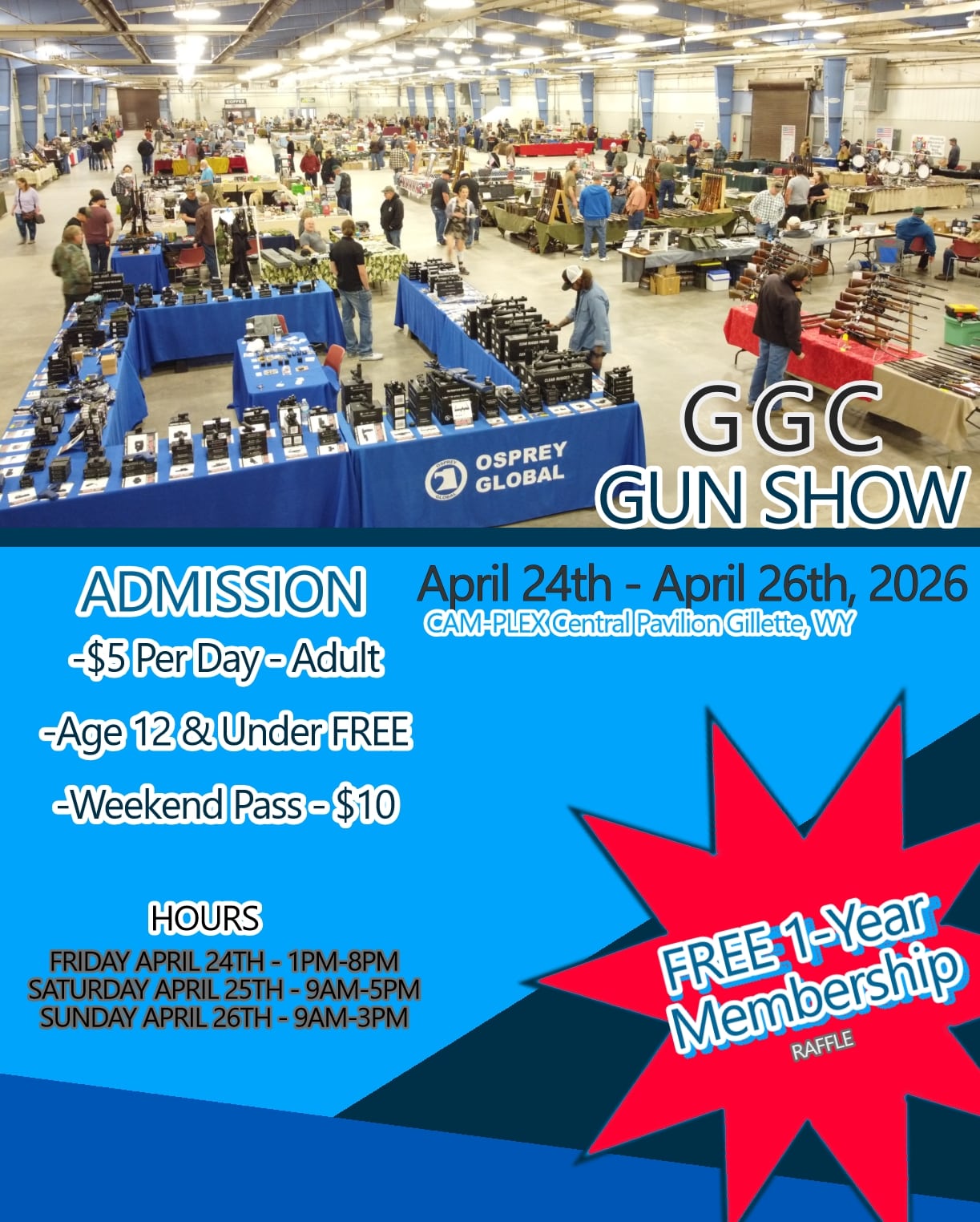 The GGC Gun Show will be held on Apr 24th-26th, 2026 in Gillette, WY. This Gillette gun show is held at Cam-plex Central Pavilion and hosted by GGC. All federal and local firearm laws and ordinances must be obeyed.