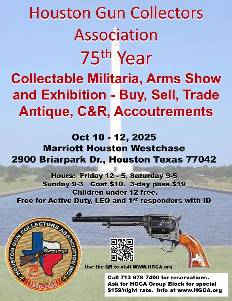 Come out & enjoy seeing a museum quality gun show !!! You may enjoy this show so much, you want to join and become a member of the Houston Gun Collectors Association!!!