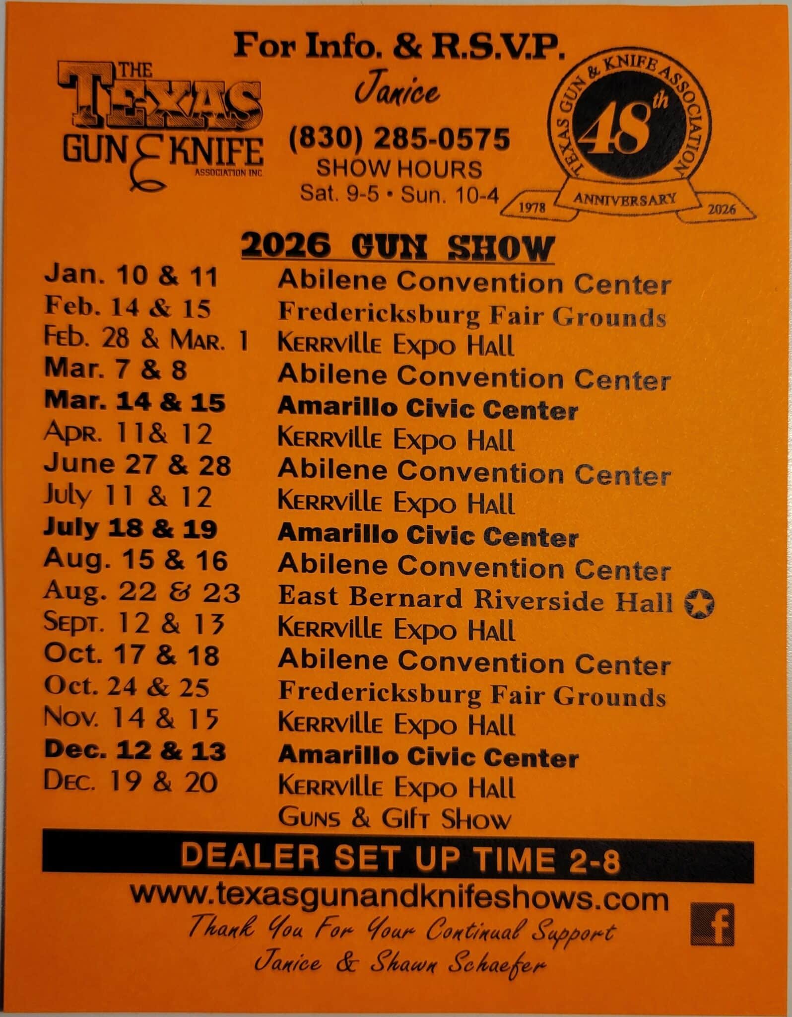 09/12/202609/13/2026Kerrville Expo Hall Guns & Gifts ShowMore Information: https://gunshowtrader.com/gun-shows/kerrville-christmas-gun-show/3785 Highway 27 Kerrville, TX 78028Texas Gun & Knife Associationfalse