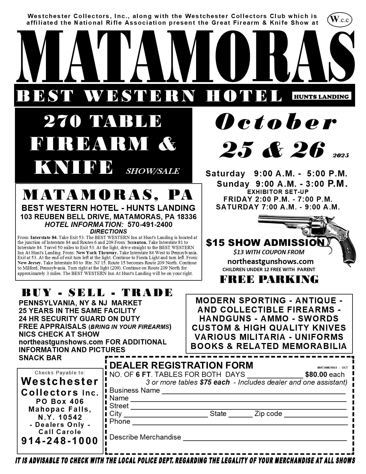 The Matamoras Gun & Knife Show will be held next on Jan 10th-11th, 2026 with additional shows on Mar 7th-8th, 2026, in Matamoras, PA. This Matamoras gun show is held at Best Western Hotel at Hunt's Landing and hosted by Westchester Collectors Inc. All federal and local firearm laws and ordinances must be obeyed.