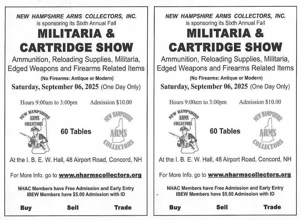 The New Hampshire Arms Collectors Inc. 6th Annual Militaria and Cartridge Show currently has no upcoming dates scheduled in Concord, NH. This Concord gun show is held at IBEW Hall and hosted by New Hampshire Arms Collectors Inc. 6th Annual Militaria and Cartridge Show. All federal and local firearm laws and ordinances must be obeyed.