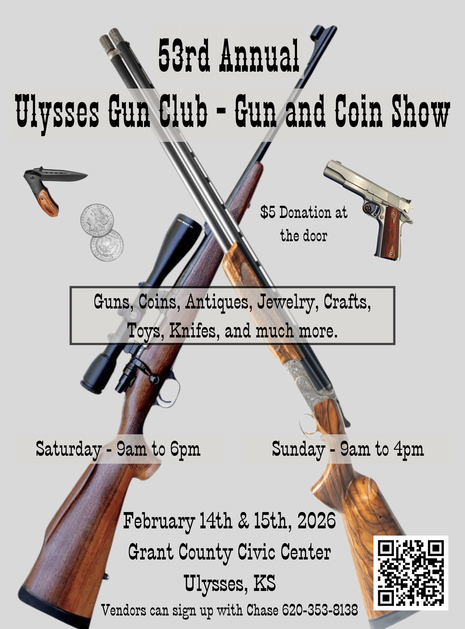 The Ulysses Kansas Gun Show will be held on Feb 14th-15th, 2026 in Ulysses, KS. This Ulysses gun show is held at Grant County Civic Center and hosted by Ulysses Gun Club. All federal and local firearm laws and ordinances must be obeyed.